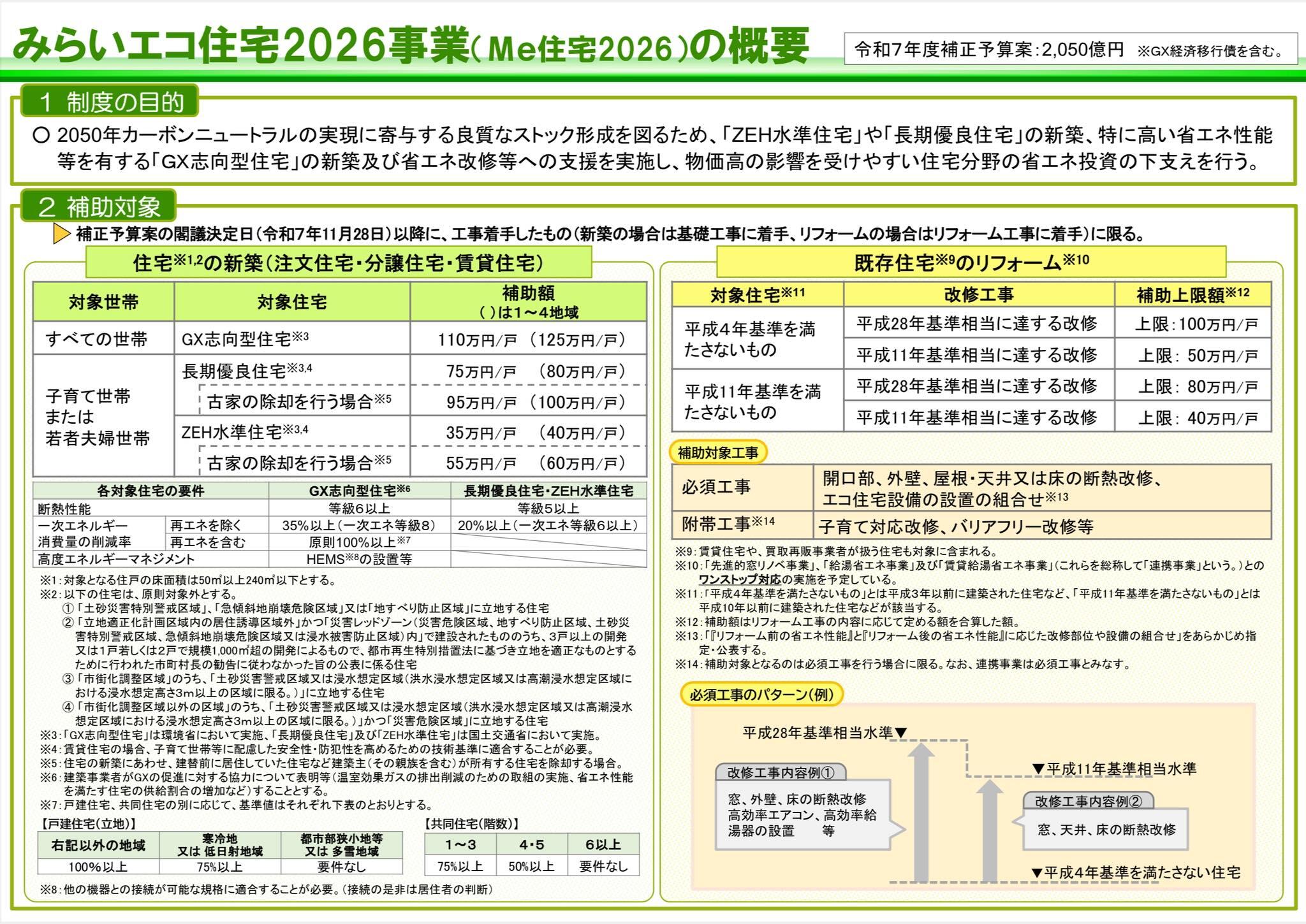 「みらいエコ住宅2026事業」が公開されましたので、新築の補助金について解説したいと思います。