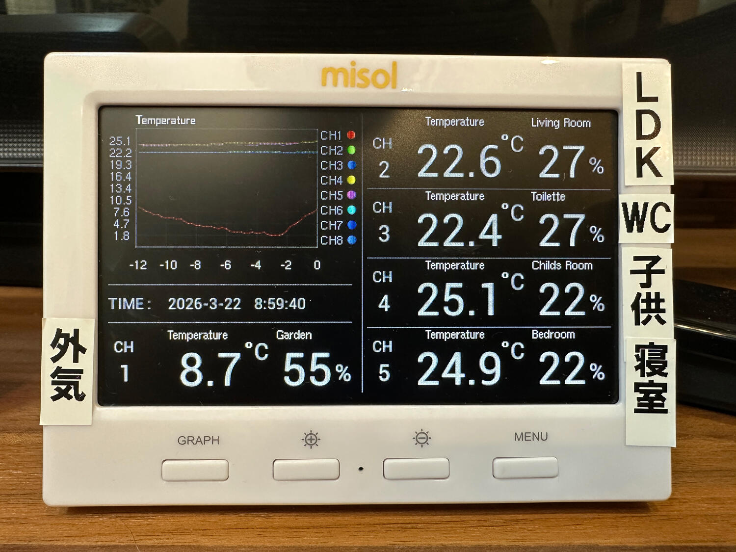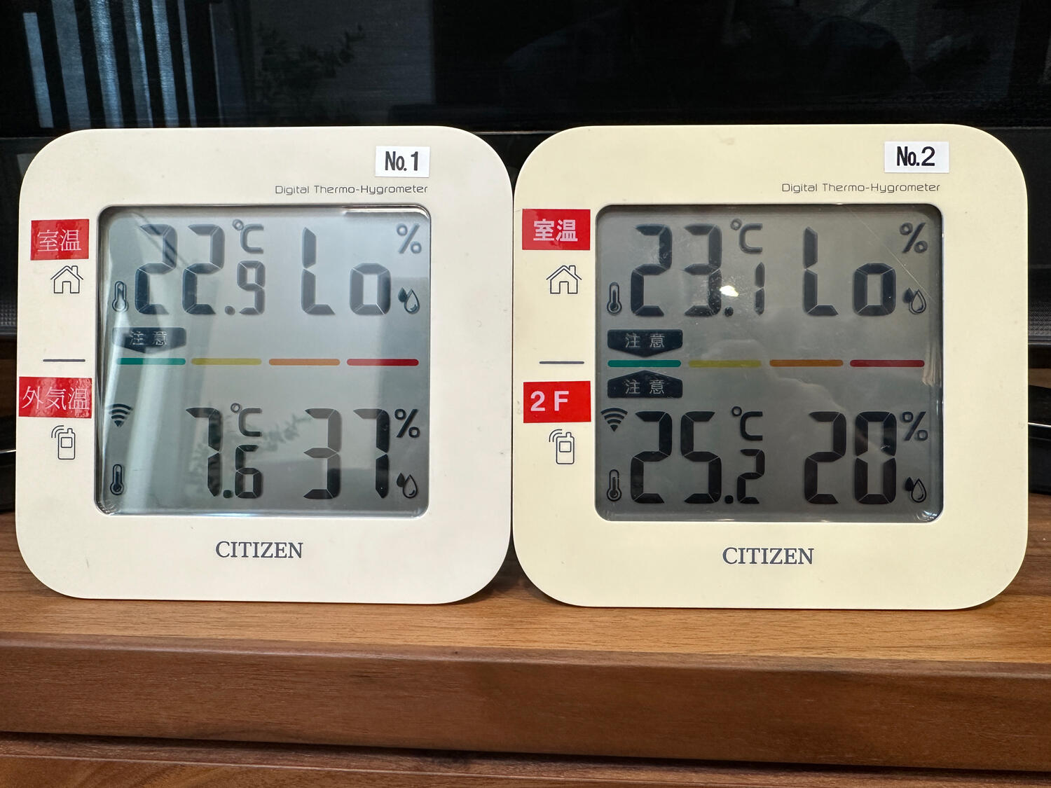 もう一つの温湿度計でも、外が7.6でも室温は22.9℃~25.2℃と暖かいです。