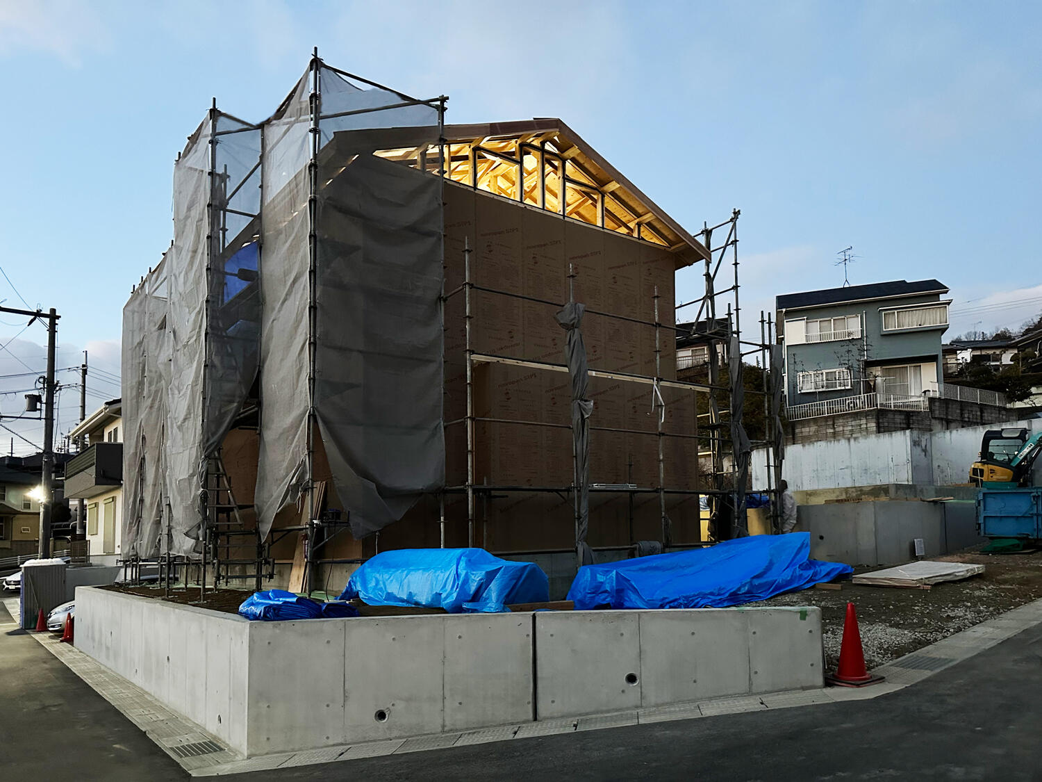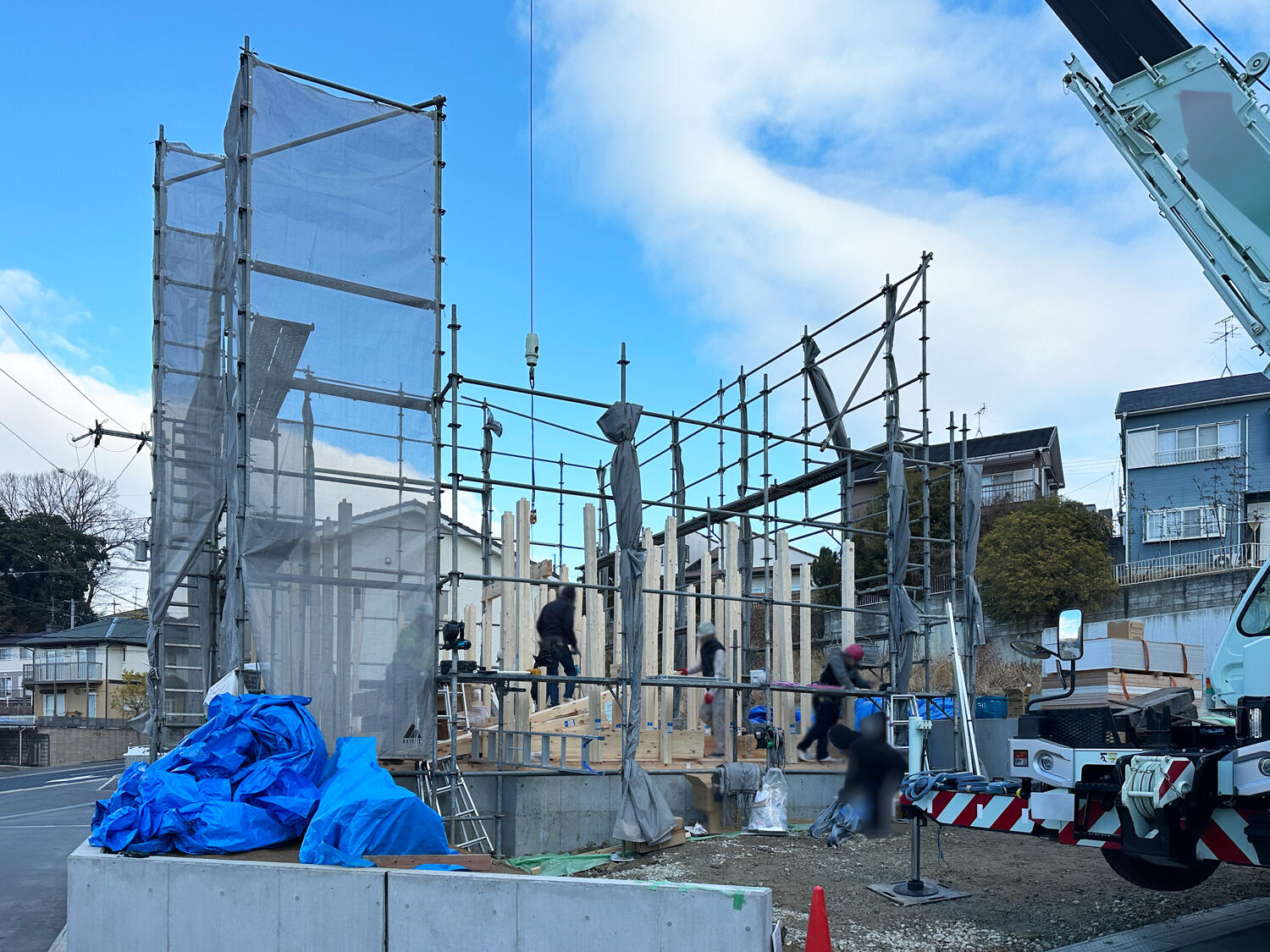 【平群町三里C】平群町で上棟しました 2025.01.12|大工工事 こんにちは。コーエイタウン三里C号地の長期優良住宅の現場では、上棟をしました。1階の床組みにあたる土台伏せは、前日に完了していますので、この状態からスタートです!1階柱の部分をたてています。2階の床組をしています。1階の構造用面材を施工し、2階の柱をたてた所です。屋根面には、アスファルトルーフィング(屋根材の下地)を施工して本日の作業終了。無事、上棟作業完了しました! 次の記事 前の記事 一覧に戻る