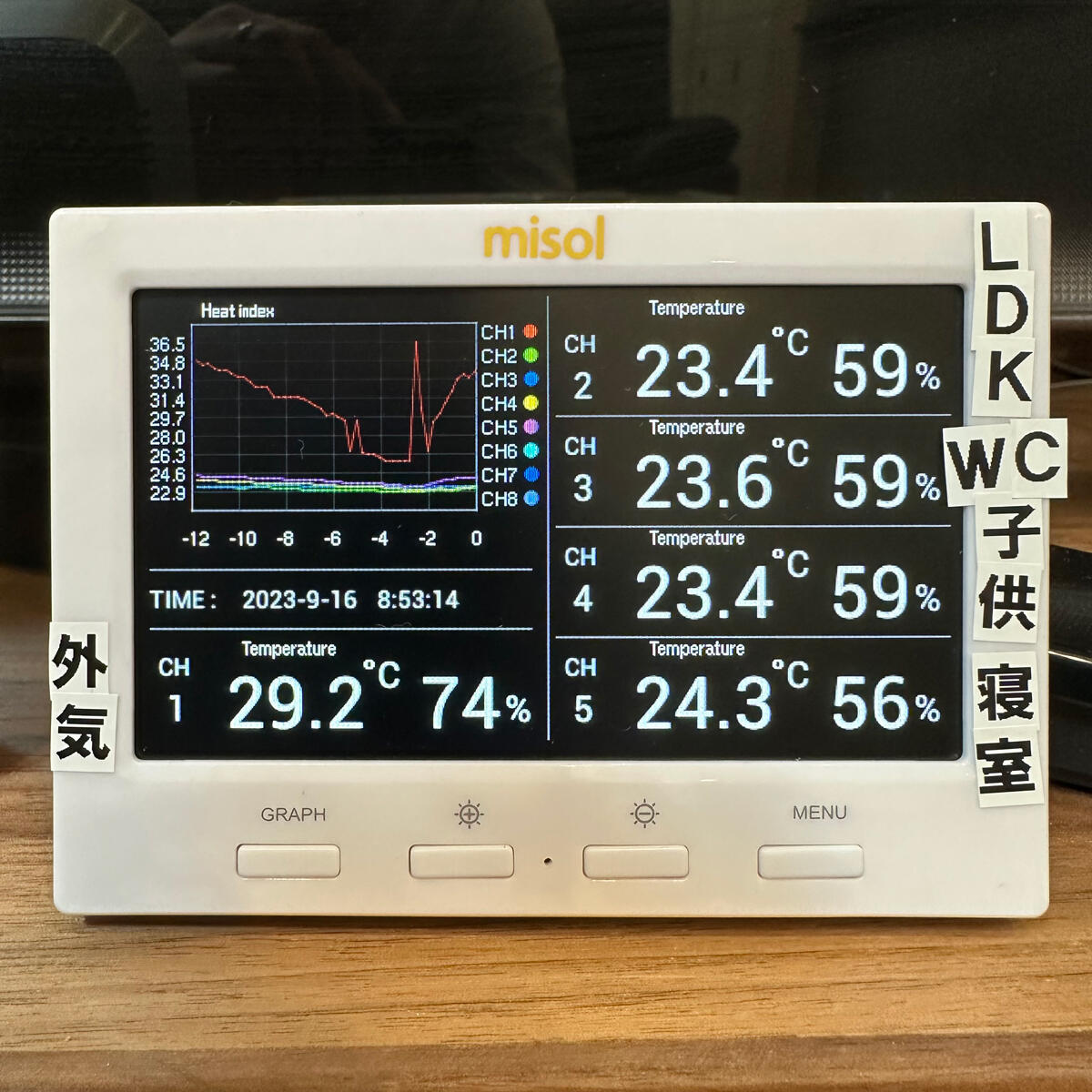 (赤い折れ線グラフは外気温ですが、直射日光が当たって異常に上昇しています)