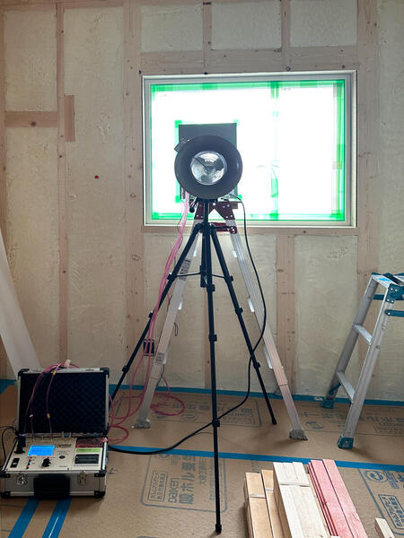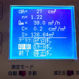 【平群町三里D】気密測定を行いました 2025.02.16 こんにちは。コーエイタウン三里D号地の長期優良住宅の現場では、気密測定(すき間の検査)を行いました。窓にバズーカのような気密測定器を設置して、すべての窓や玄関を閉めます。気密測定器を設置する窓は、しっかり養生をして隙間が無いようにして検査を行います。結果は、画面に出てきます。C値=0.1㎠/㎡正確な数字は、14÷122.51=0.114すごく良い数値です! 次の記事 前の記事 一覧に戻る