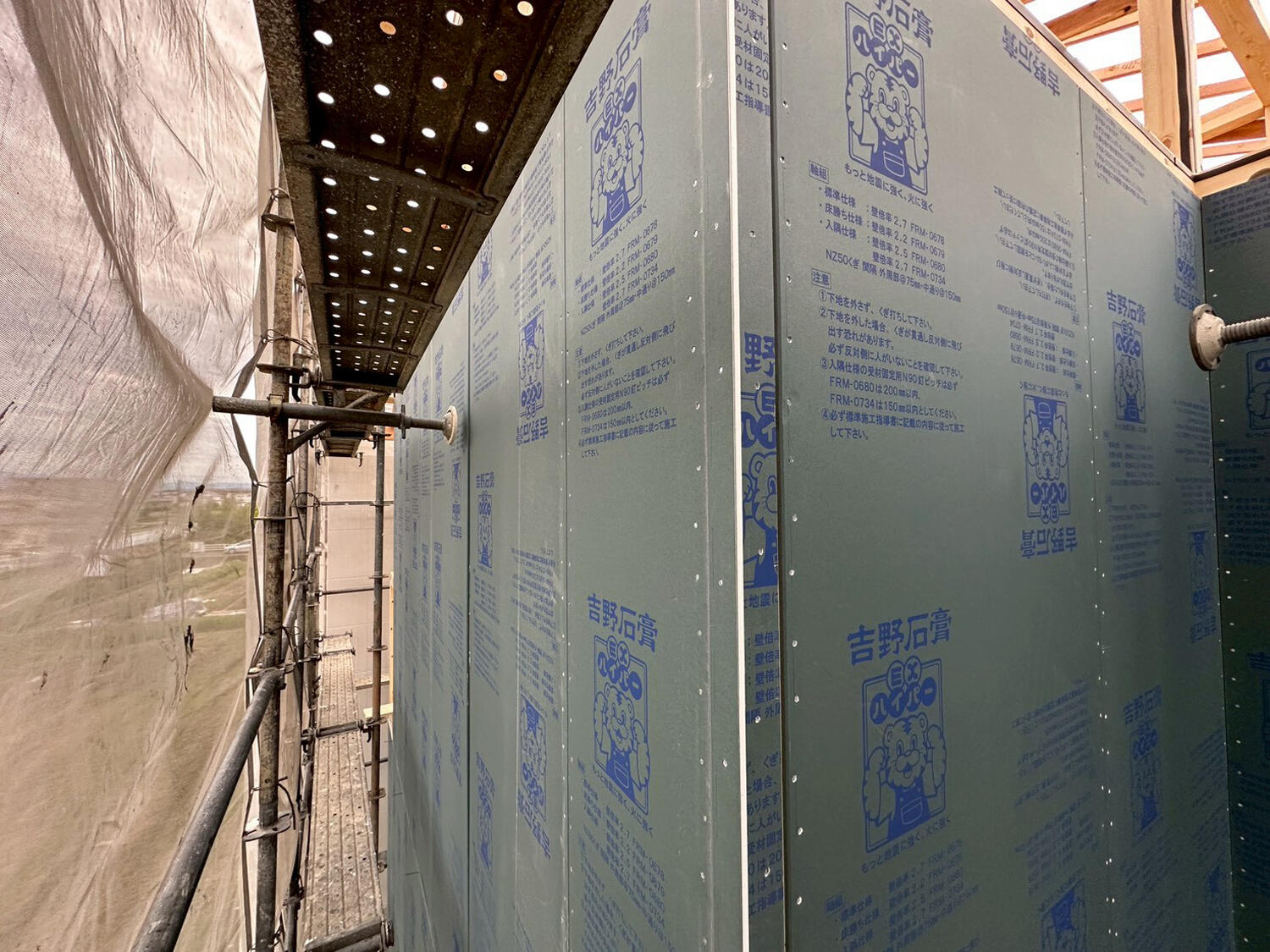 柱を立て、梁を組み、構造用面材のタイガーEXハイパーを張っていきます。
