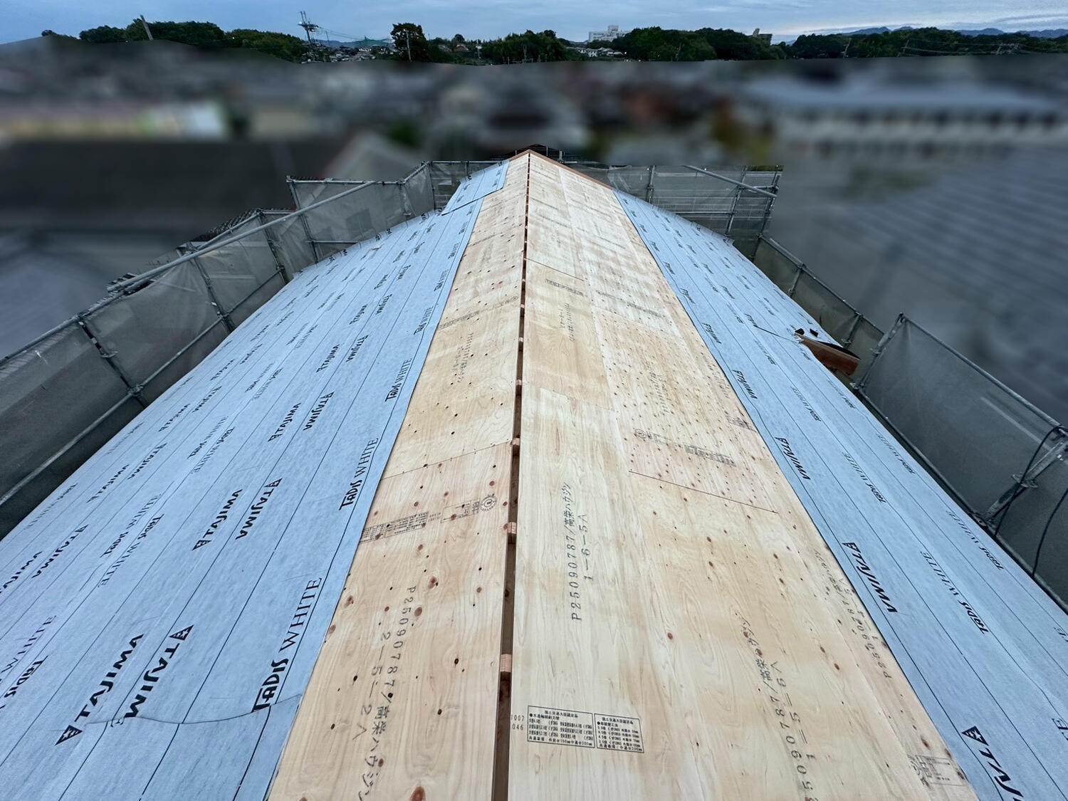 屋の下地・野地板(のじいた)を施工し、ゴムアスルーフィングを施工しています。