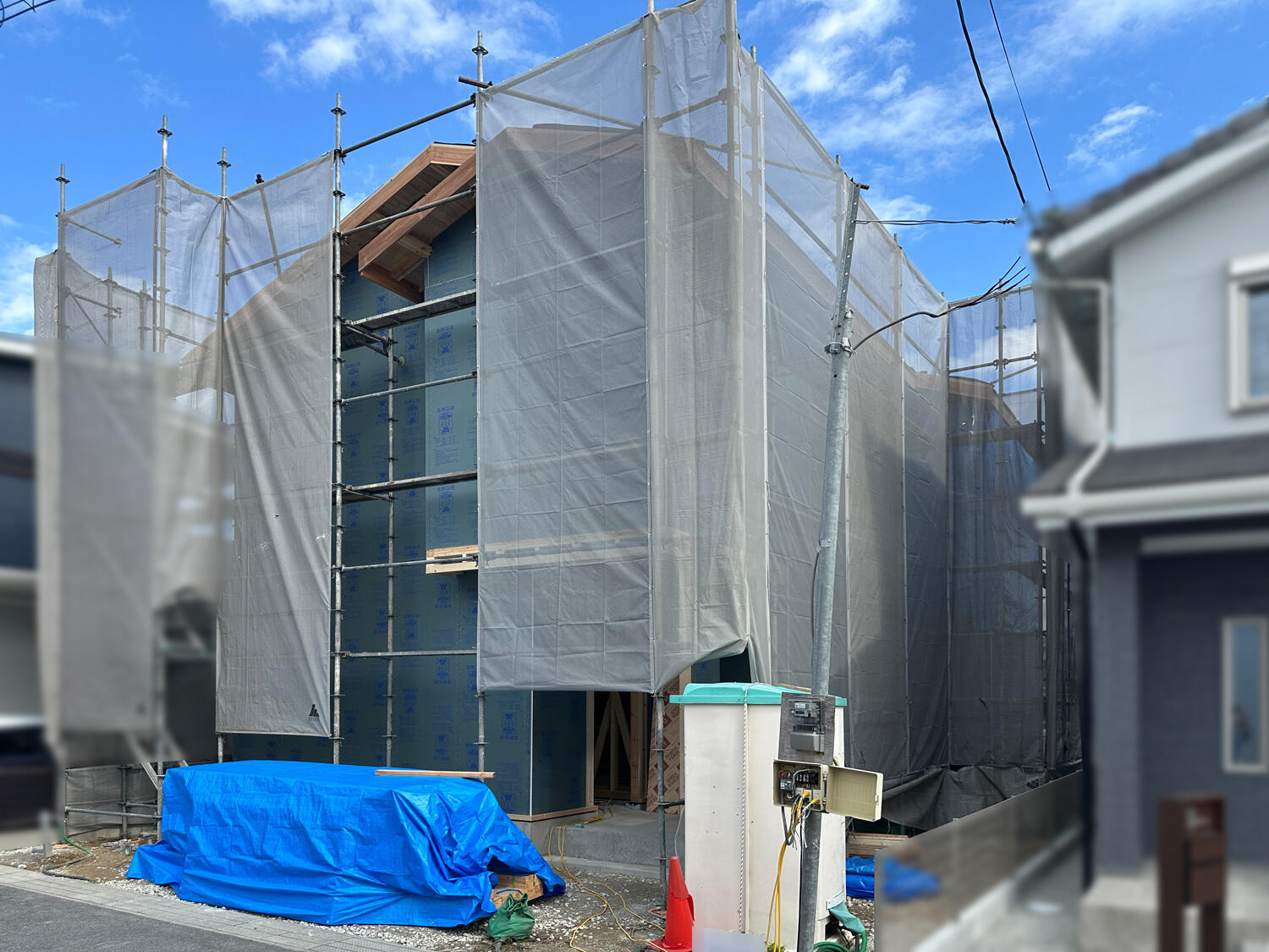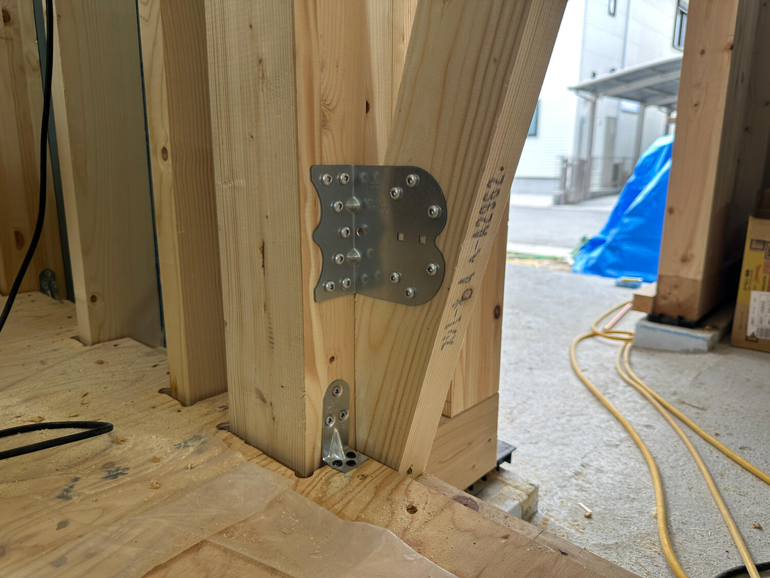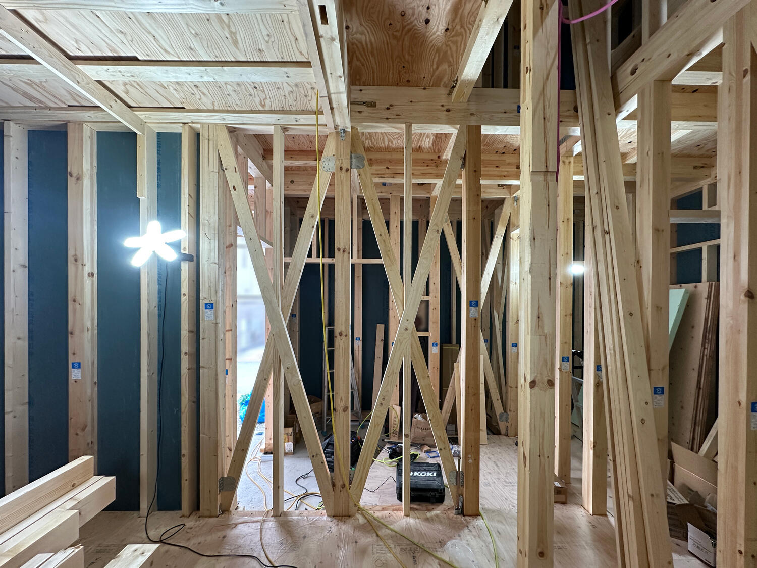【香芝市】筋交いの施工を進めています 2025.10.24|大工工事 こんにちは。香芝市・コーエイタウン上中の長期優良住宅&ZEH(ネット・ゼロ・エネルギー・ハウス)の現場では、筋交い(すじかい)の施工を進めています。筋交いの足元には、筋交いプレートという建築金物を施工しています。柱と筋交いをガッチリ固定します。外部の構造用面材、タイガーEXハイパーの施工がほぼ完了しています。 次の記事 前の記事 一覧に戻る