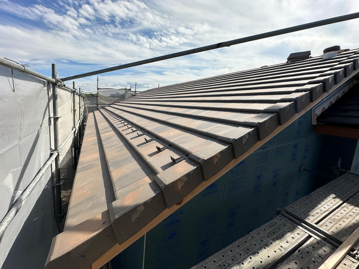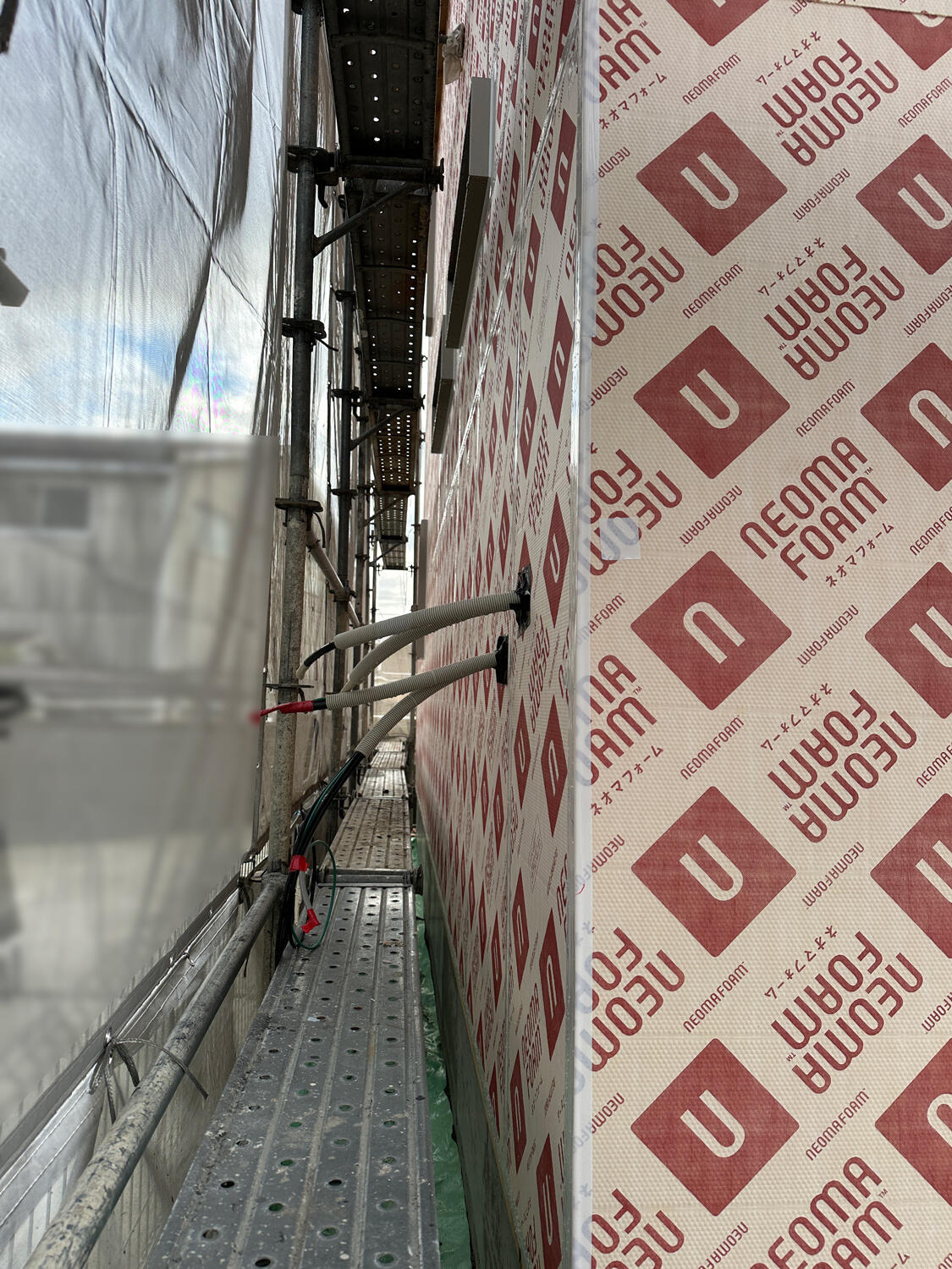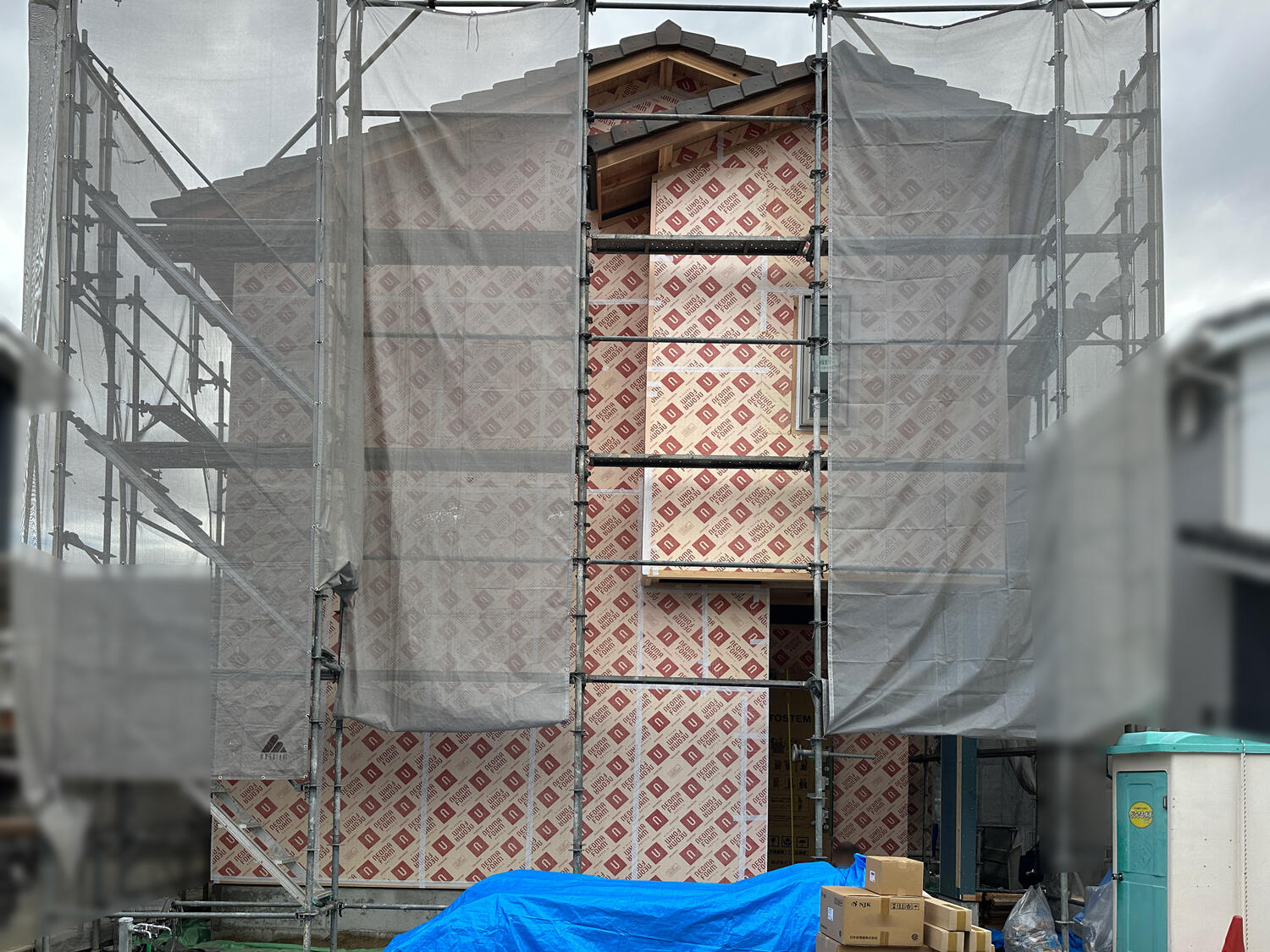 【香芝市】樹脂サッシ・外張り断熱・陶器瓦を施工しました 2025.10.31|屋根工事|断熱工事|窓・サッシ こんにちは。香芝市・コーエイタウン上中の長期優良住宅&ZEH(ネット・ゼロ・エネルギー・ハウス)の現場では、リクシルの樹脂サッシ・EWが入りました。高断熱の玄関ドア・リクシルのグランデル2の枠も入っています。長期耐久性に優れた陶器瓦を施工しました。今回はノルディックブラウン色を採用いただきました。外壁の外張り断熱のネオマフォームを張り進めています。ピンク色の高性能の断熱材ですっぽり覆います。家全体ではこんな感じ。薄いピンク色がかわいいですね。 次の記事 前の記事 一覧に戻る