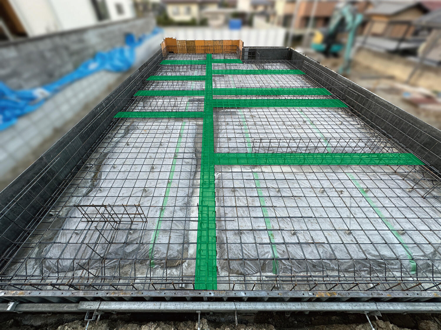 【奈良市】基礎の鉄筋が組み上がりました 2025.11.10|基礎工事 こんにちは。奈良市の長期優良住宅&ZEH(ネット・ゼロ・エネルギー・ハウス)の現場では、基礎の鉄筋が組み上がりました。緑色の部分が地中梁(ちちゅうばり)です。地中梁は普通の基礎より、更に下に鉄筋を組んで上からの荷重に耐える部分です。許容応力度計算(きょようおうりょくどけいさん)という500ページに及ぶ構造計算をすると地中梁が必要だという結果が出ます。地震にも耐風にも強い基礎、建物になっています。 次の記事 前の記事 一覧に戻る