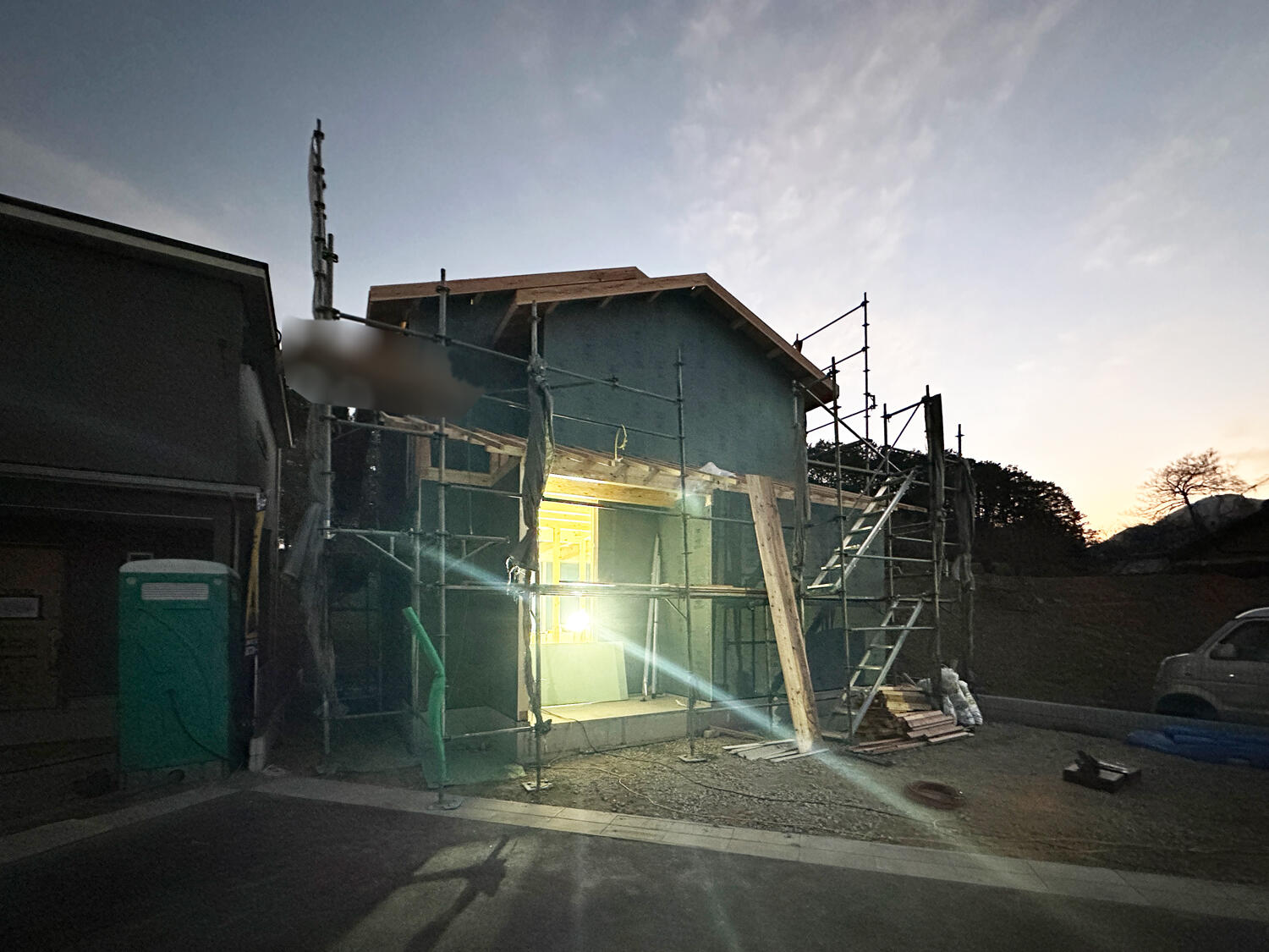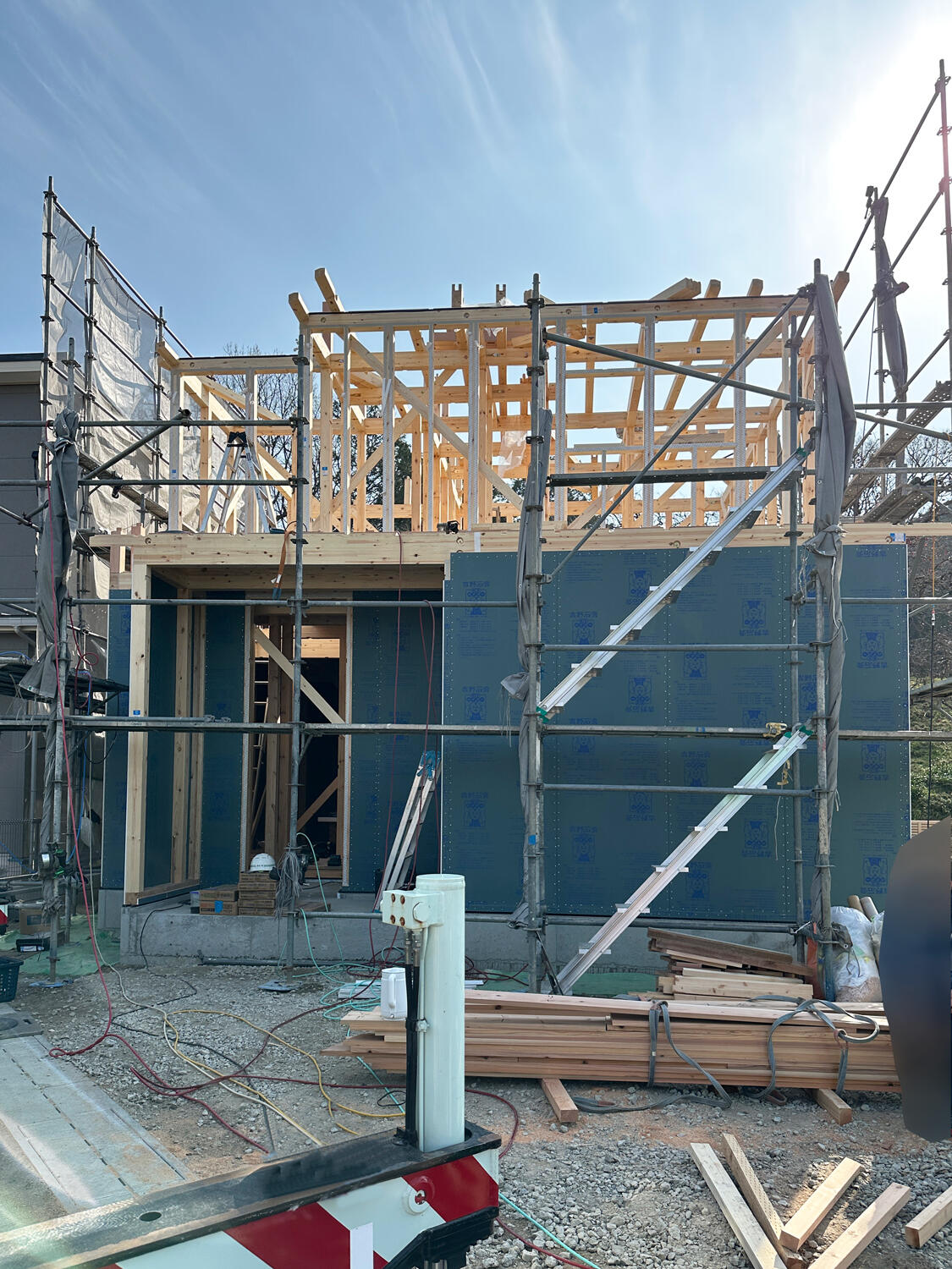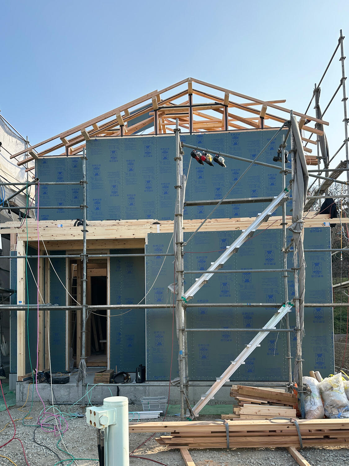 【香芝市】上棟しました 2026.01.17|大工工事 香芝市狐井の長期優良住宅の現場では、上棟をしました。クレーンを設置して上棟作業を開始しました。1階部分が組みあがりました。引き続き2階部分も組みあがりました。徐々にお家の形が分かるようになってきました。屋根の形も分かるようになってきました。外壁下地用耐力面材を張り終え、本日の作業は完了しました。お施主様、上棟おめでとうございます! 次の記事 前の記事 一覧に戻る
