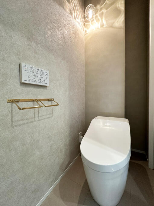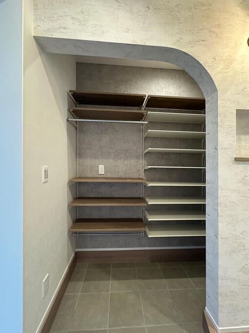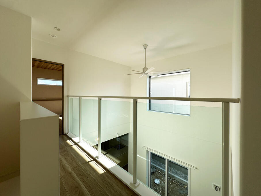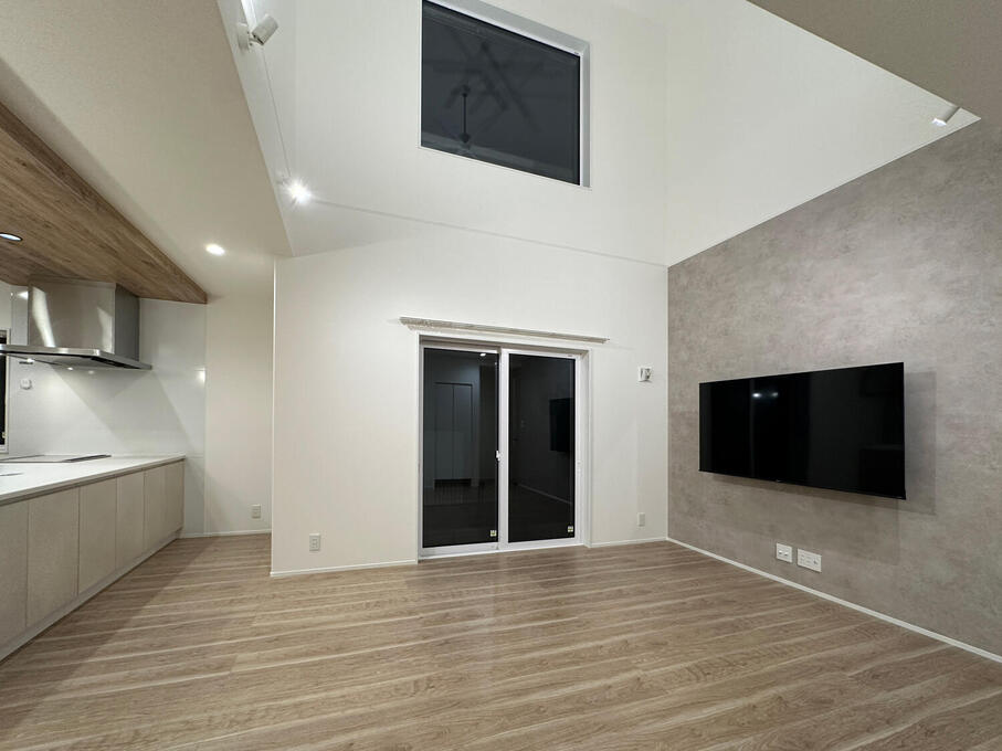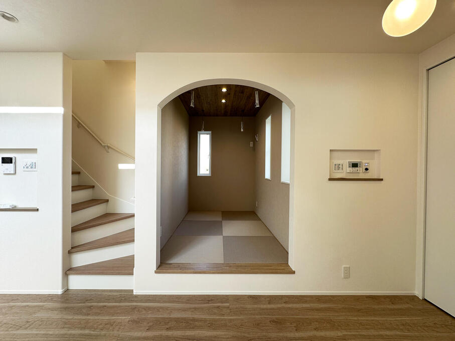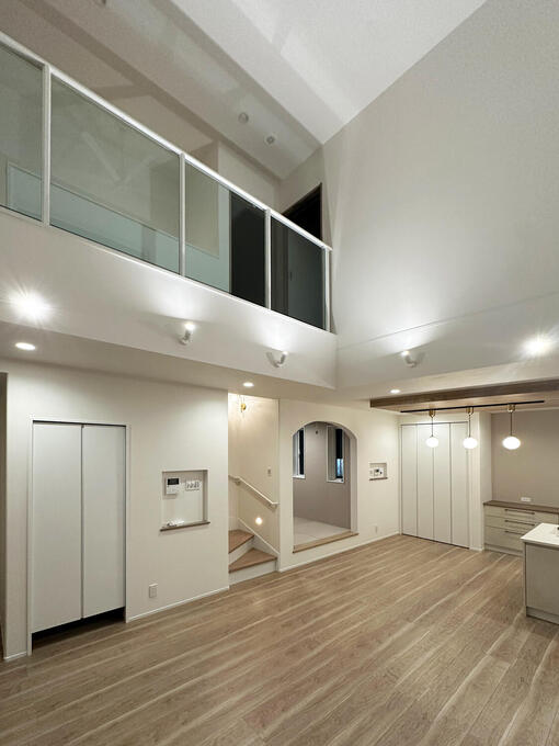 吹き抜けで明るいリビング真鍮の小物とR垂れ壁がかわいいお家